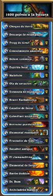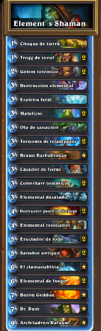 Poco a poco el Chamán va resurgiendo de sus cenizas de antaño, con LOE, Chamán a obtenido el potencial y resistencia que tanto le faltaba, esto, nos lo proporciona el Trogg de túnel, a primera vista, parece una carta más, la cual no va a ser nada relevante si la metemos en nuestra baraja, pero junto las cartas de sobrecarga que contenemos en el mazo y aprovechando la tara que nos conlleva el usar cartas con sobrecarga, reforzaremos nuestra mesa con la fuerza que vaya acumulando. El Trogg de túnel es una carta clave para los comienzos de las partidas y empezar a controlar la situación. (también en esta primera versión dispondremos de una copia de Elemental desatado, carta la cual nos vendrá muy bien a la hora de empezar a meter esbirros de gran aguante a partir del turno 3.)